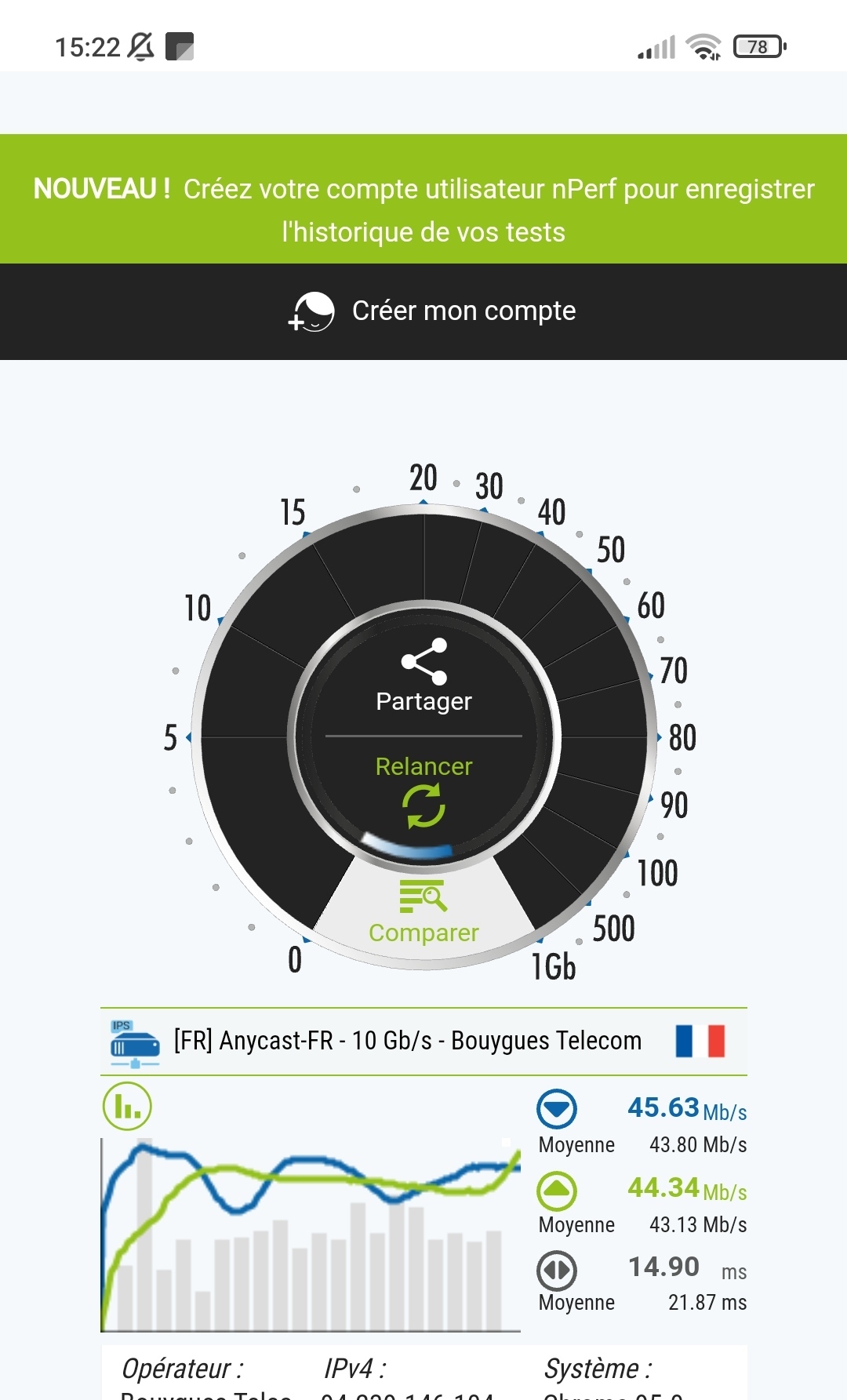 Bon après je mets pas la BBox en cause, l'AP Wifi est clairement mauvais, la clé wifi est un truc à moins de 20 balles sur Amazon de mémoire donc y'a plein d'autres goulots d'étranglement que la box elle même Le même speedtest avec mon téléphone en wifi 6 sur la même config pour le reste me donne 705Mbits/s, c'est déjà plus honorable et ça élimine une défaillance de la box |