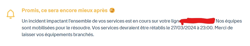 Quand on avait été coupé et avec un débit famélique à la suite d'un incendie dans un équipement, j'avais suivi le retour à la normale sur le twitter/X de ceux qui gèrent le réseau dans le département (Axione/THD42), mais rien par BT à part le message générique sur l'espace client (comme chez pratiquement tous les FAI). Et si tu pars chez quelqu'un d'autre, attention à ce que la panne ne soit pas plus globale et que l'autre FAI ne soit pas impacté!