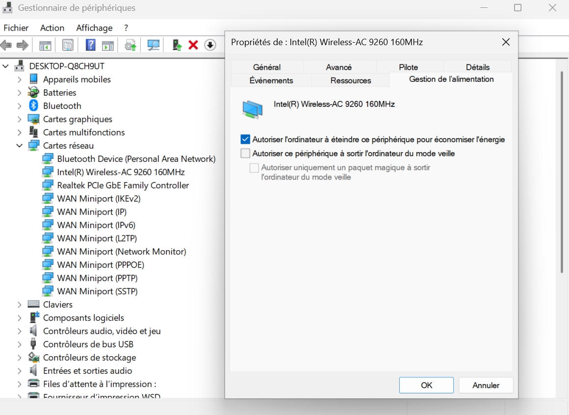 Kalipok Gniii ? | Je suis sous Windows 11, je sais où se trouve le gestionnaire de périphériques, et je te dis que je n'ai pas de gestion de l'alimentation sur mes périph réseau ^^ |
