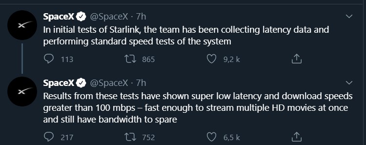 artiflo Un est tout, tout est un. | SpaceX annonce que des tests donnent une "super faible latence" et un débit de l'ordre de 100Mb/s. |