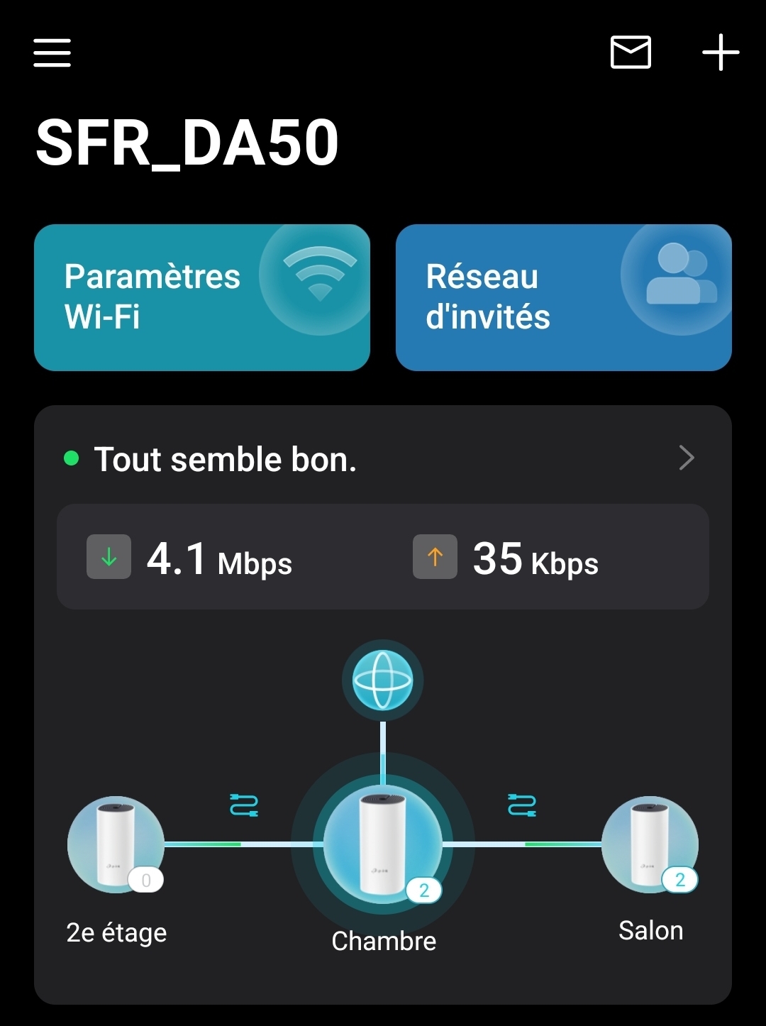 noxauror Next. | J'ai 200Mbit/s de débit sur les Deco installés, ça me va bien Mais pour l'instant ça ne fonctionne pas avec mon boitier TV (SFR STB7) que je veux connecter en Wi-Fi C'est normal que "Chambre" soit en Principal avec les 2 autres en satellite ? Message cité 1 fois Message édité par noxauror le 30-10-2023 à 19:12:08 |